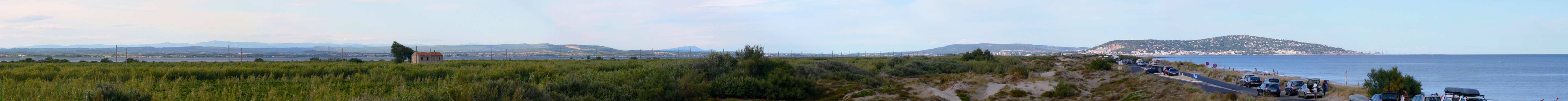 Panoramiques pris entre Marseillan et Séte (34) avec la colline de Séte en arrière plan Cette bande de sable sauvage de plusieurs km séparant l'étang de Thau de la Méditerranée va prochainnement disparaître au profit d'un amménagement moderne la protégeant. Encore un endroit sauvage qui va disparaître ...
